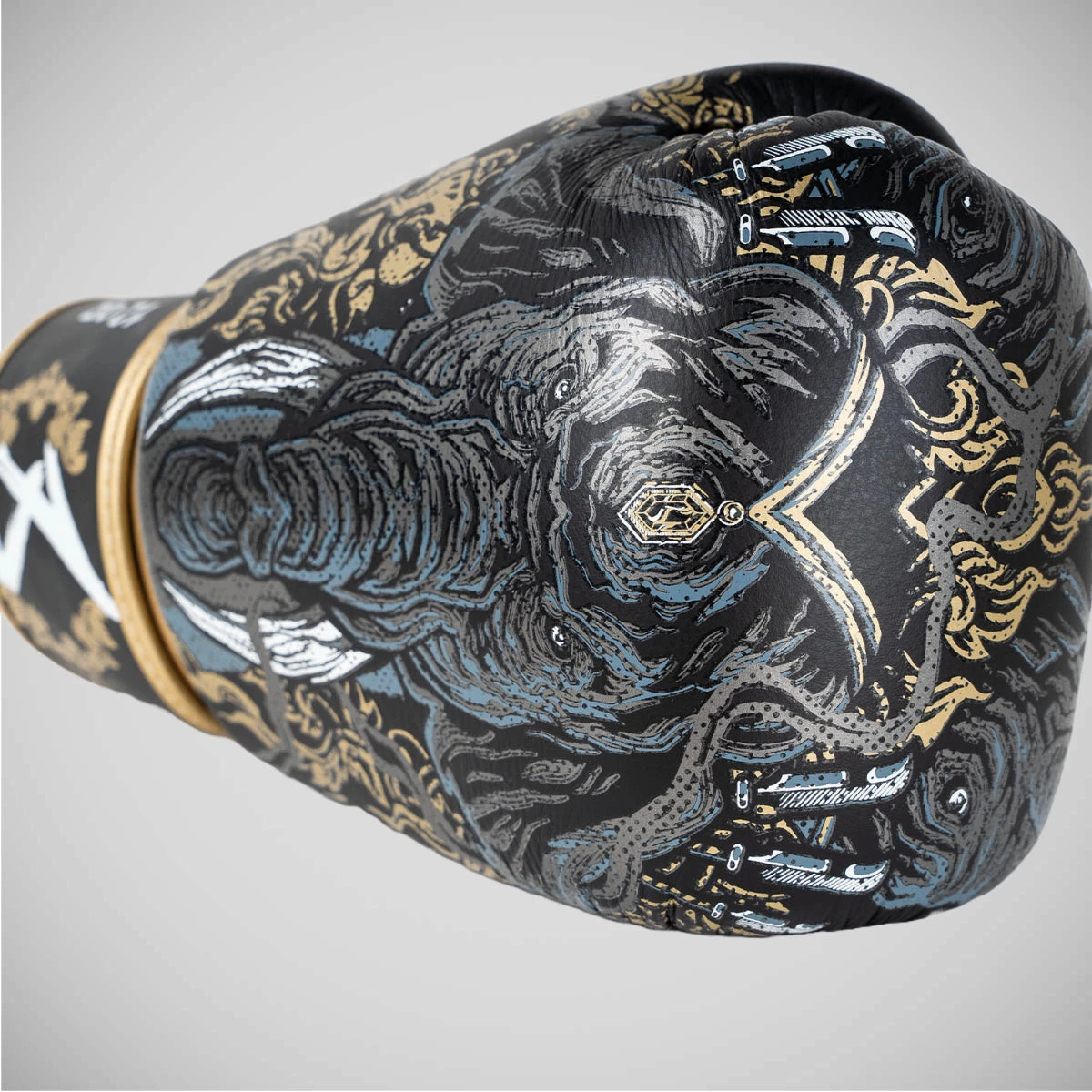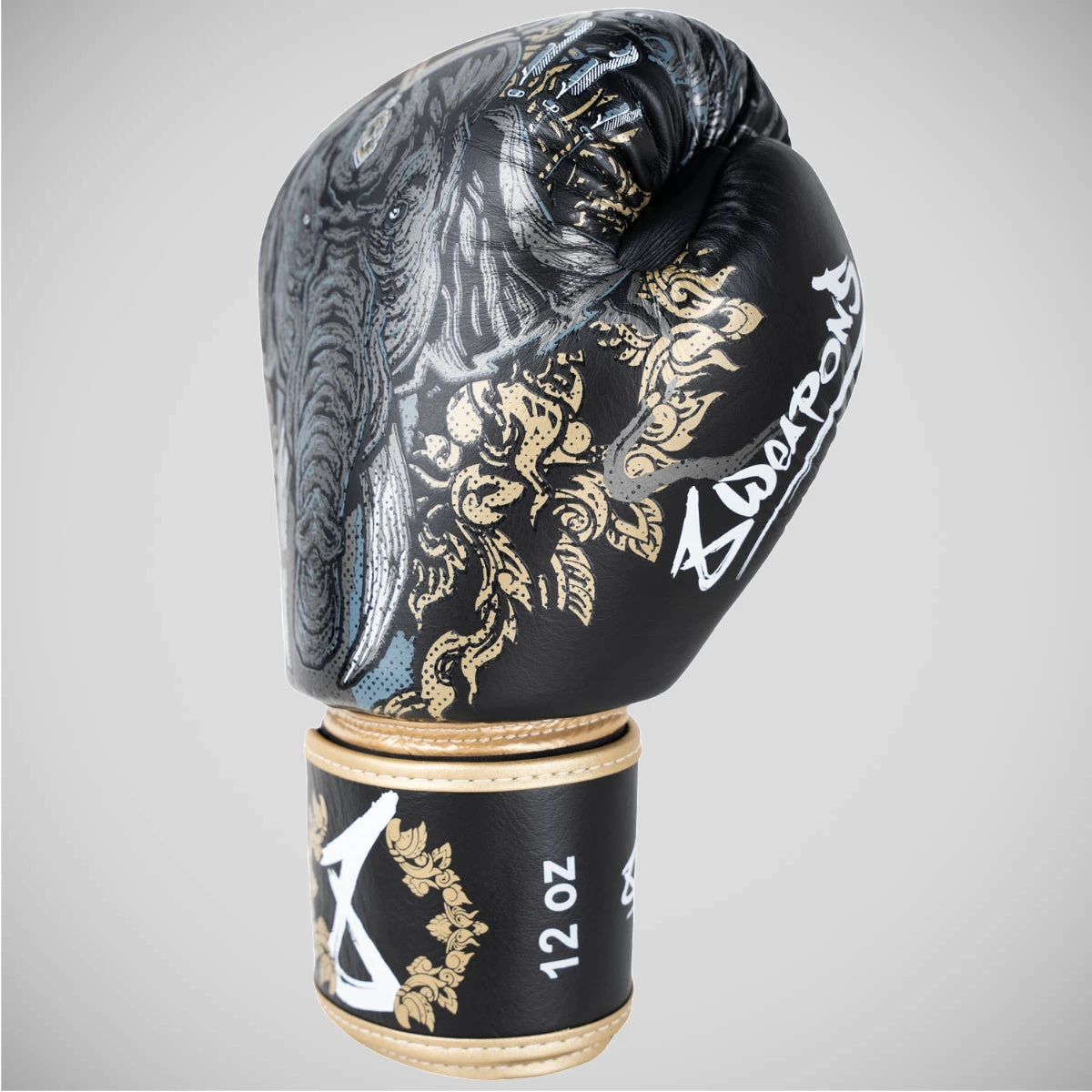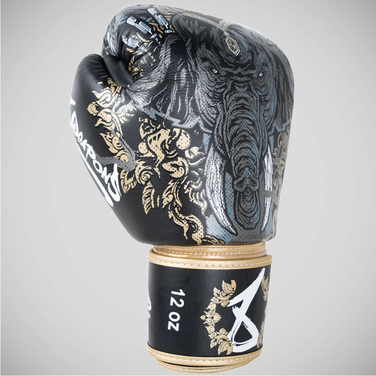 Embrace the legacy of Thai warriors with the Black/Gold 8 Weapons Three Elephants 2.0 Boxing Gloves. Erawan, the three-headed elephant, represents the unity of northern, southern, and central Thailand—the very essence of Muay Thai.
