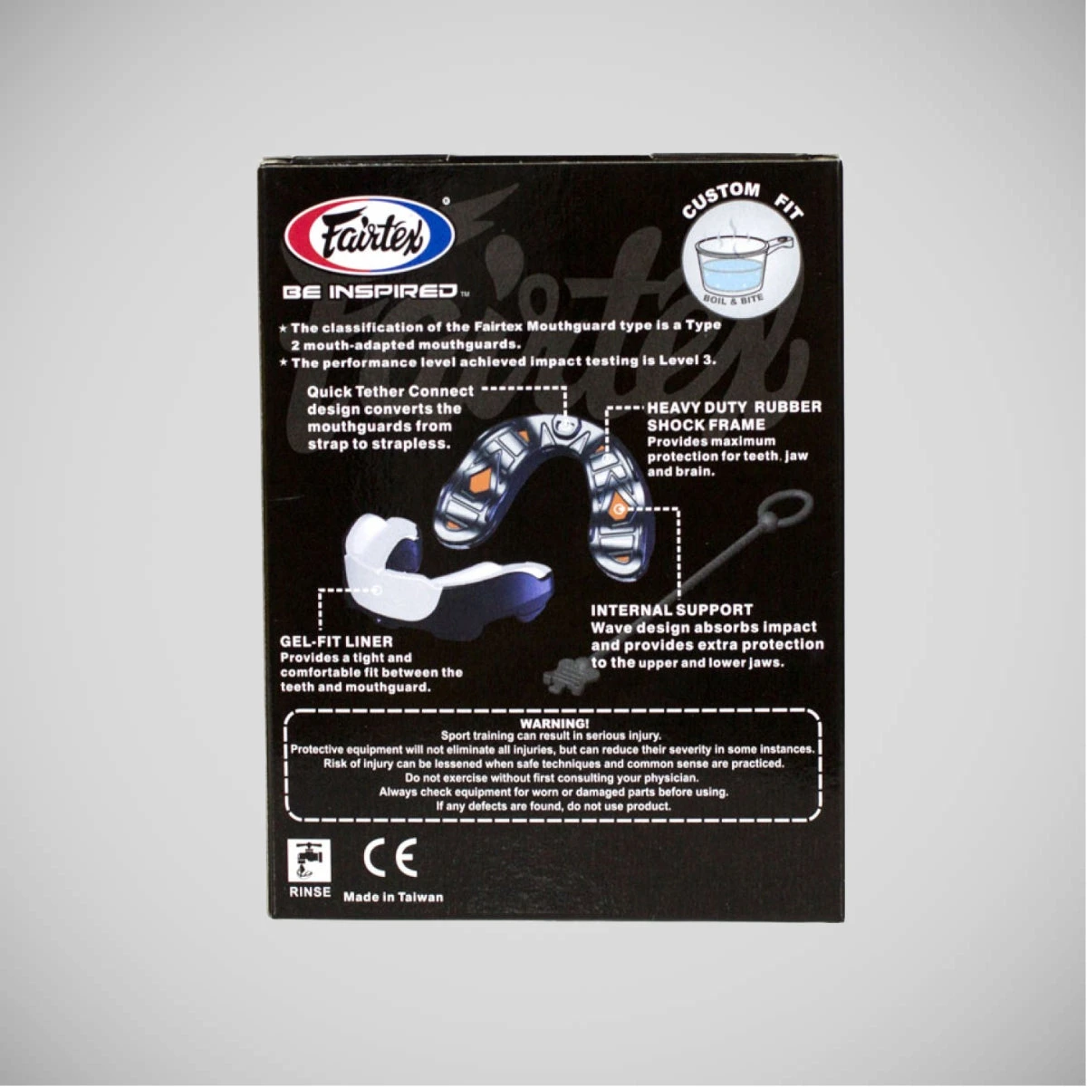 - CE Safety Approved: Rest assured, the Fairtex Mouthguard meets the highest safety standards. It has been CE Safety approved, signifying its compliance with stringent regulations and guaranteeing its quality and reliability. When you choose Fairtex, you choose a brand dedicated to delivering superior products that prioritize your well-being.