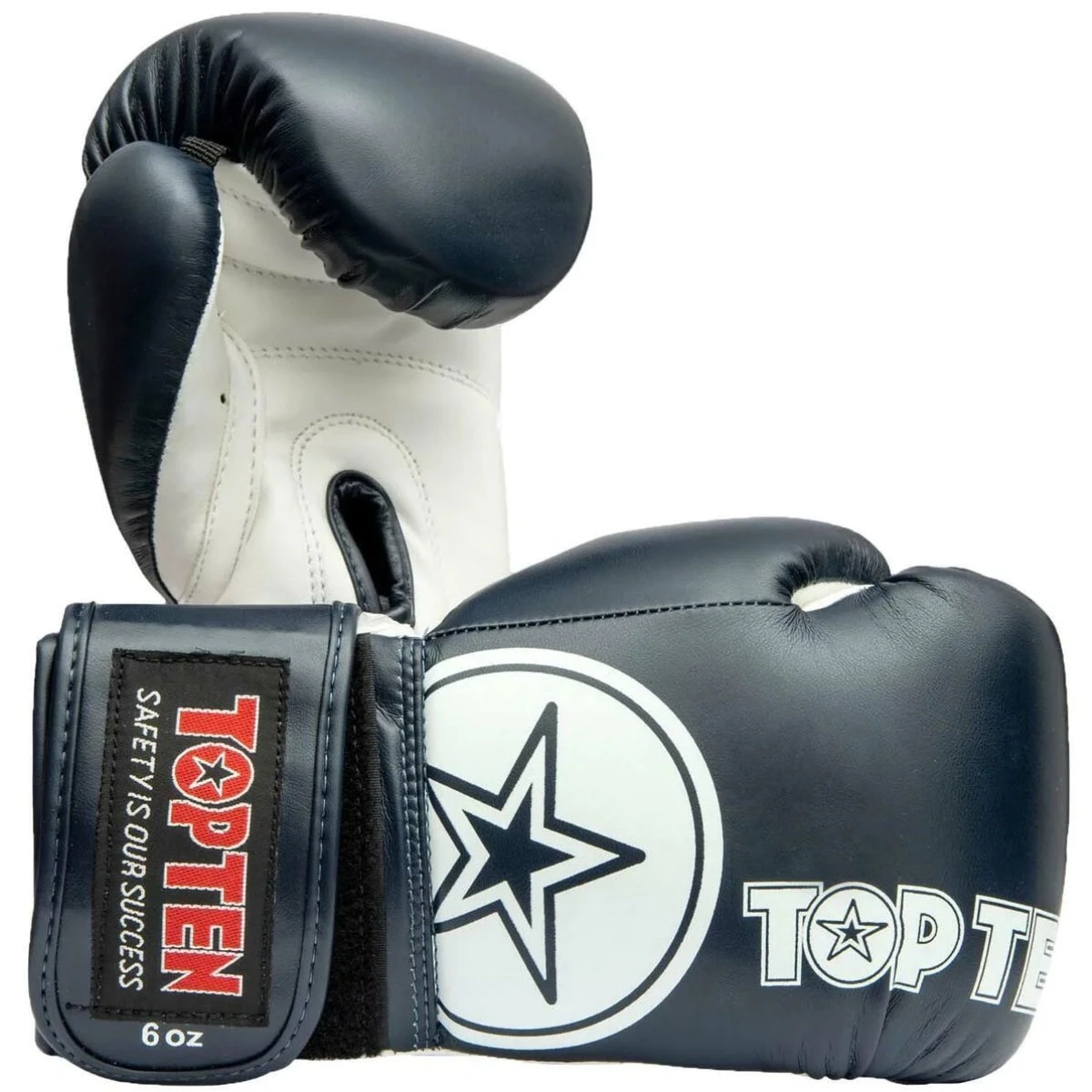 Introducing the Blue/White Top Ten Kids Boxing Gloves – a powerhouse gear crafted exclusively for our budding martial artists.