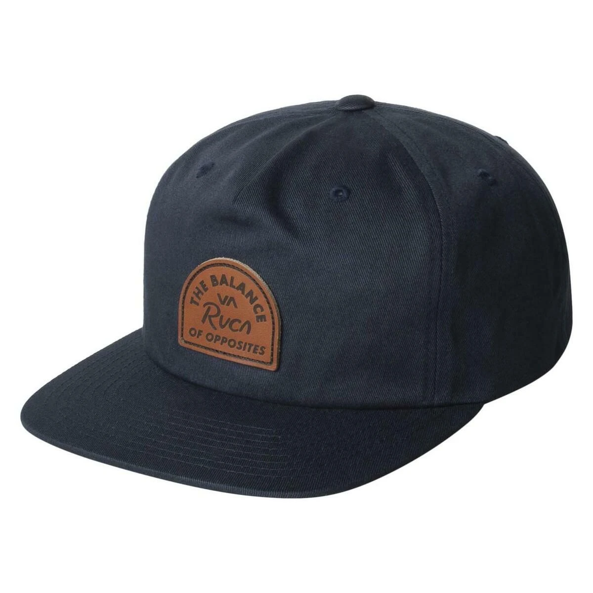 The RVCA Main Snapback Cap has a leather patch on the front. The adjustable snapback closure ensures a good fit.