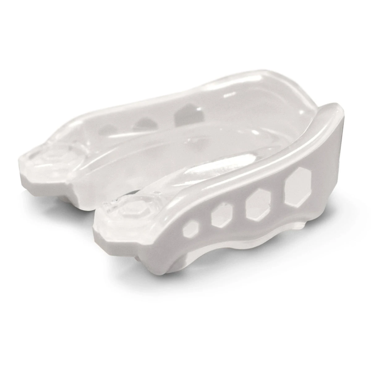This shock doctor mouth guard features a heavy duty rubber exoskeletal shock frame and gel liner to provide maximum protection, fit and comfort, in an easy-to-fit, triple layer design.
